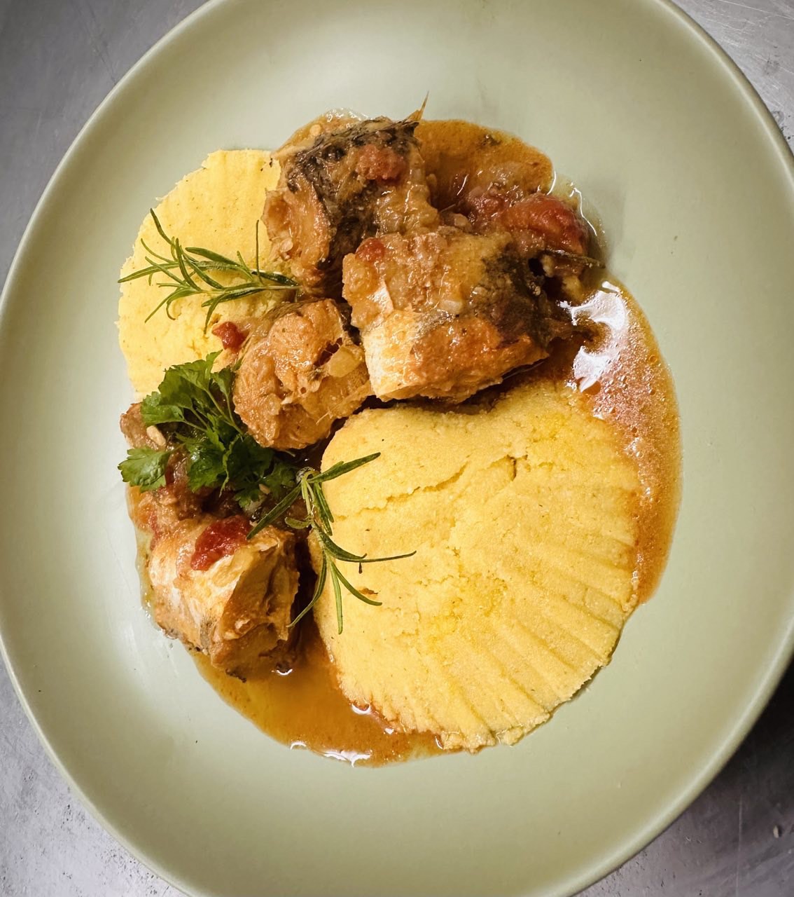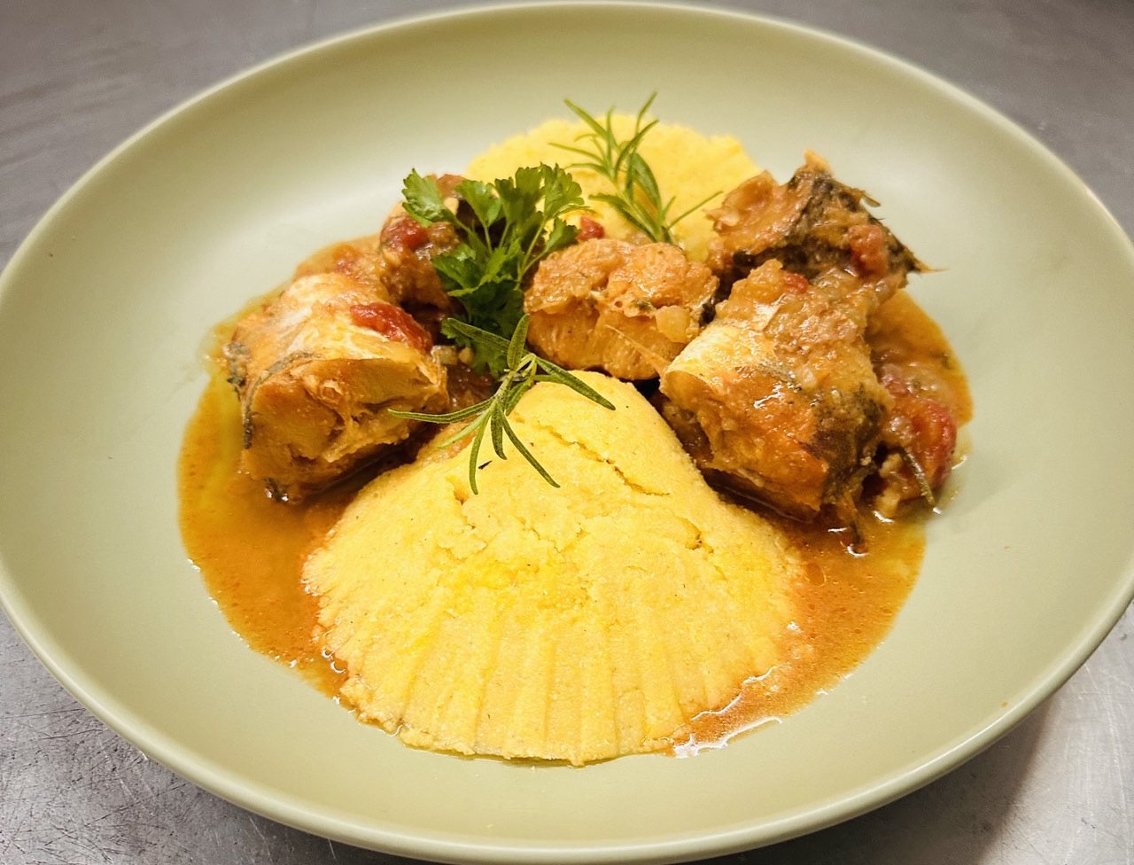 Zatim dodajte sitno seckani beli luk, kratko prodinstajte, dodajte sitno seckani pelat te dodajte belo vino I začine. Prokuvajte 5 minuta pa dodajte oslić, kuajte još malo i ugasite vatru. Popravite ukus solju i biberom.Servirajte uz kuvanu palentu .